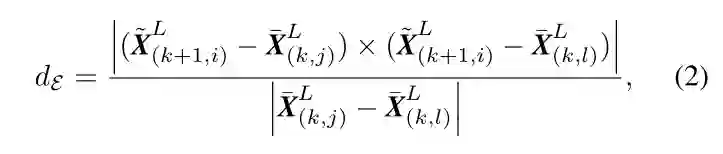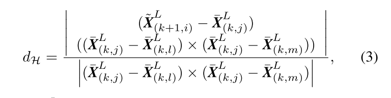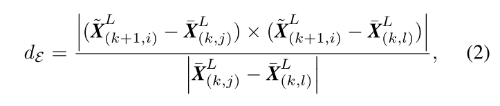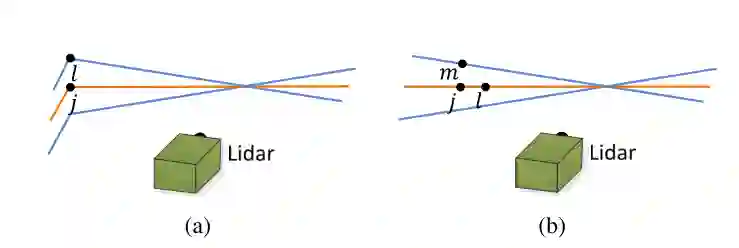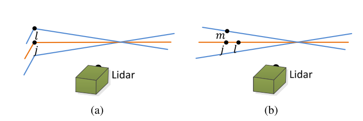 边缘点到边缘线的对应。首先找到边缘点i对应的上一帧数据中最近的两个点,然后判断这两个点是否是边缘点,j和l必须是不同的线上中的点,因为一次一个线在某一段中最多有一个边缘点。如下图中的图a所示,蓝色线是P¯k线扫探测到的边缘点,橙色线是相邻的线扫。