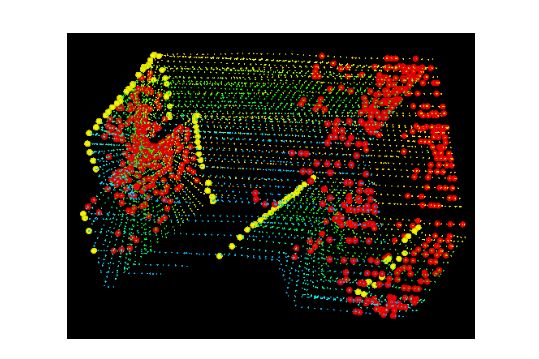 通过比较曲率,选出曲率大的边缘点和曲率小的平面点。为了防止特征点聚集,将每一次扫描的点云分成四份,从每份中选取两个曲率最大的点作为边缘点和四个曲率最小的点作为平面点。