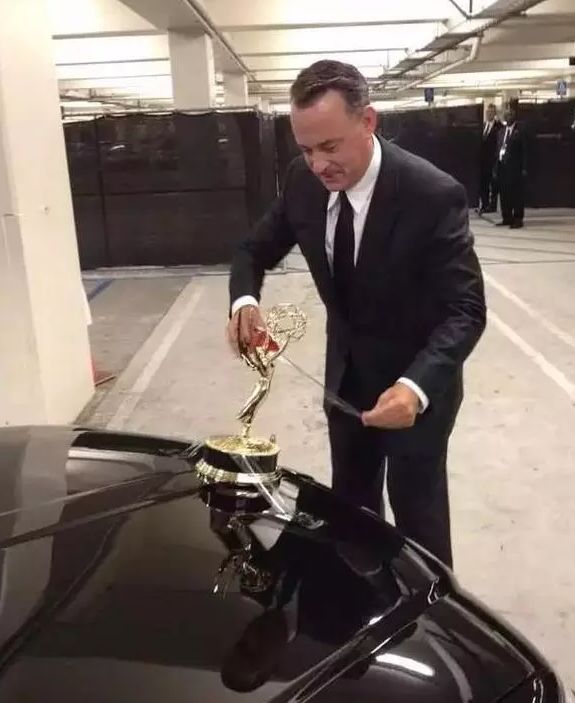 获得艾美奖之后,他居然用胶带把奖杯粘在了汽车的引擎盖上“显摆”起来,还得意地在推特上炫耀:“那几天出行我好威风啊!”