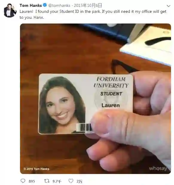 ▲ Lauren!我在公园捡到了你的学生证,如果你还需要我让工作人员联系你。汉克斯