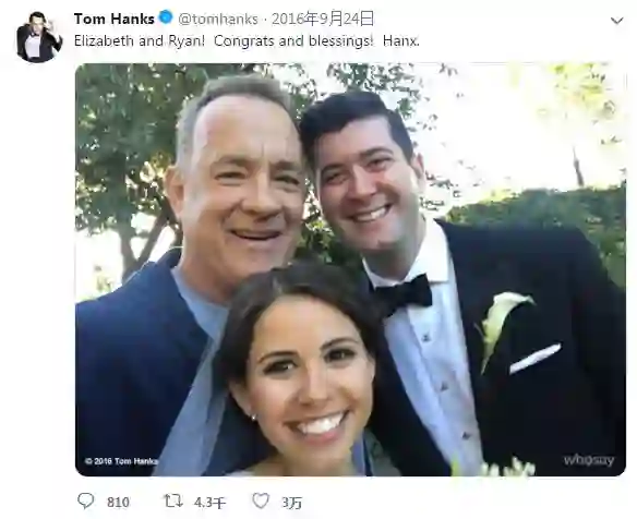 汉克斯不仅道喜,还一通赞美,并拉着他们合影。