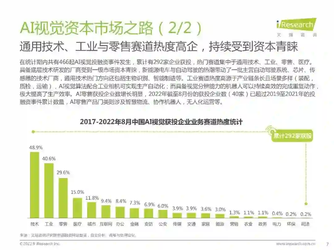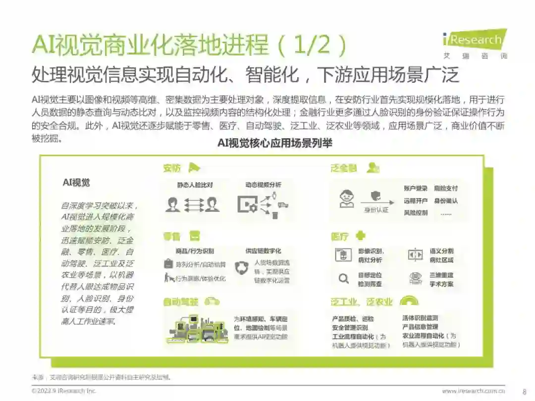 AI视觉产业背景:AI视觉又称计算机视觉,得益于深度学习技术的快速发展,已于安防、金融、制造、零售等多领域实现规模化商用。2022年,AI视觉相关投融资热潮全面复苏,通用技术、工业与零售赛道热度高企,持续受到资本青睐。2021年我国AI视觉产品的市场规模占整个人工智能行业的49.6%,达到990亿元。从资本热度、市场规模、场景泛用、带动作用来说,AI视觉已成为AI产业发展的主战场,未来增量动力依然强劲。