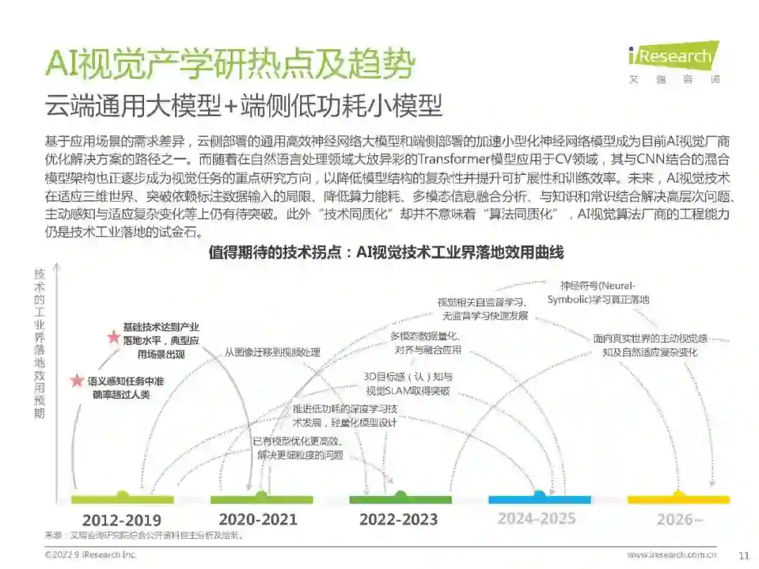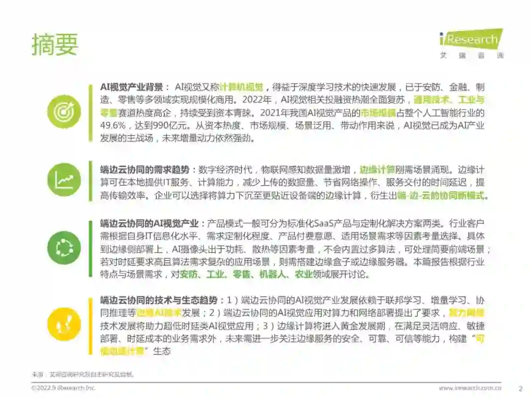 端边云协同的技术与生态趋势:1)端边云协同的AI视觉产业发展依赖于联邦学习、增量学习、协同推理等边缘AI技术发展;2)端边云协同的AI视觉应用对算力和网络部署提出了要求,算力网络技术发展将助力超低时延类AI视觉应用;3)边缘计算将进入黄金发展期,在满足灵活响应、敏捷部署、时延成本的业务需求外,未来需进一步关注边缘服务的安全、可靠、可信等能力,构建“可信边缘计算”生态