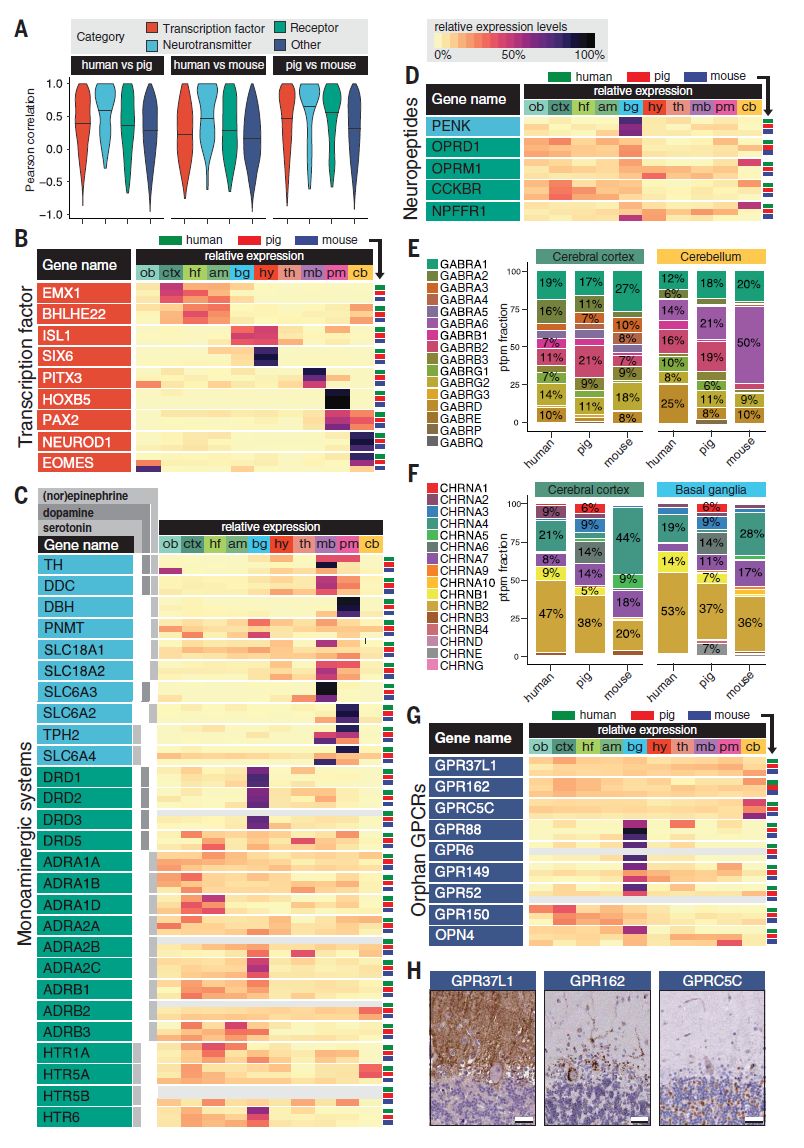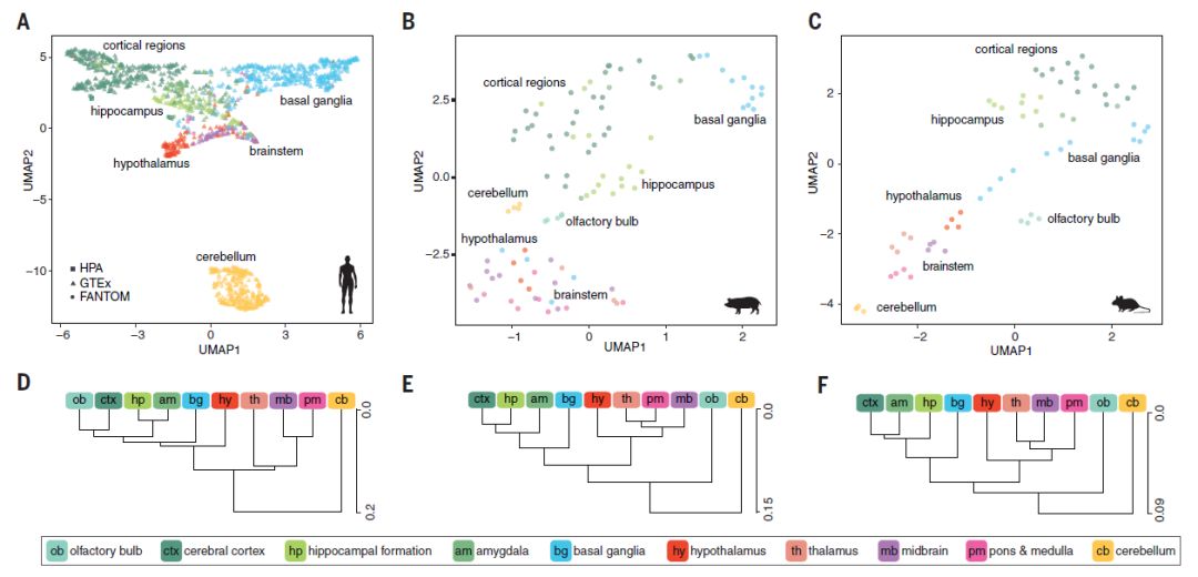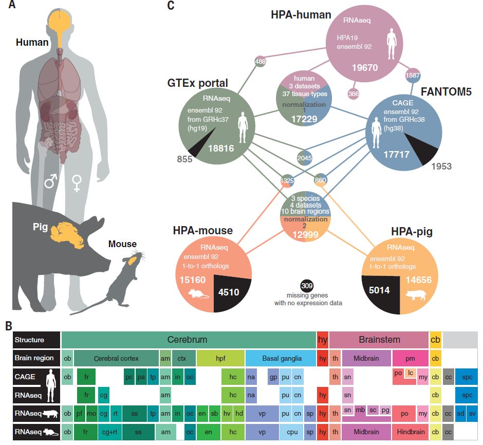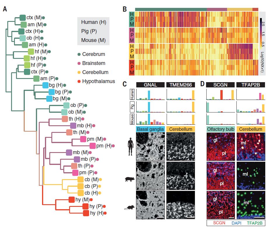 研究人员对人、猪和小鼠大脑的主要区域进行了全面的转录组分析