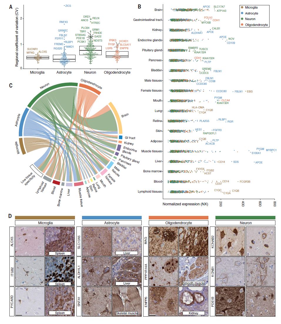 另一个有趣的发现是,大脑的不同细胞类型与周围器官共享特定的蛋白质。