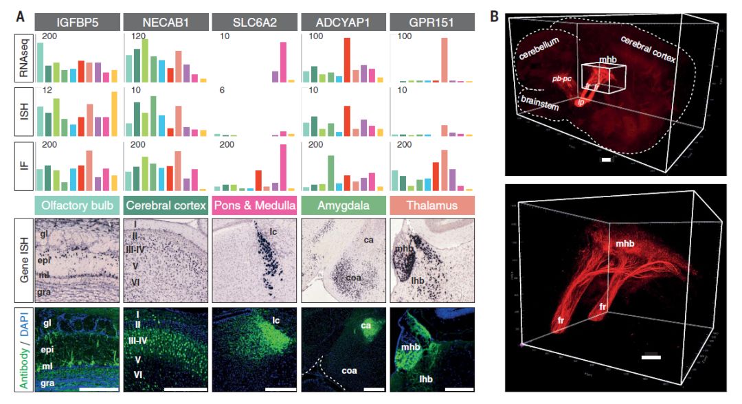 小鼠大脑区域转录组、原位杂交和免疫荧光数据比较(来源:Science)