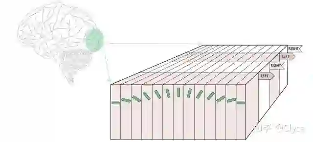 如图所示,V1皮层中,神经细胞以左眼-右眼不断交错排列。每个细胞拥有自己的感受野且每一组细胞只对特定的方向敏感,同一个Columns内的不同细胞则对该方向的不同尺寸敏感。配合跨Columns的long range connection,进一步组织出对不同曲率曲线敏感的神经信号。