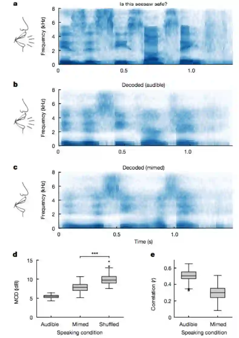 为了验证解码器是否依赖参与者的语音,研究者进行了一项对比实验:研究者请一名参与者大声朗读句子,然后再只张嘴不出声地读同样的句子。结果表明,后者的合成语音频谱与前者具备相似的频谱曲线。