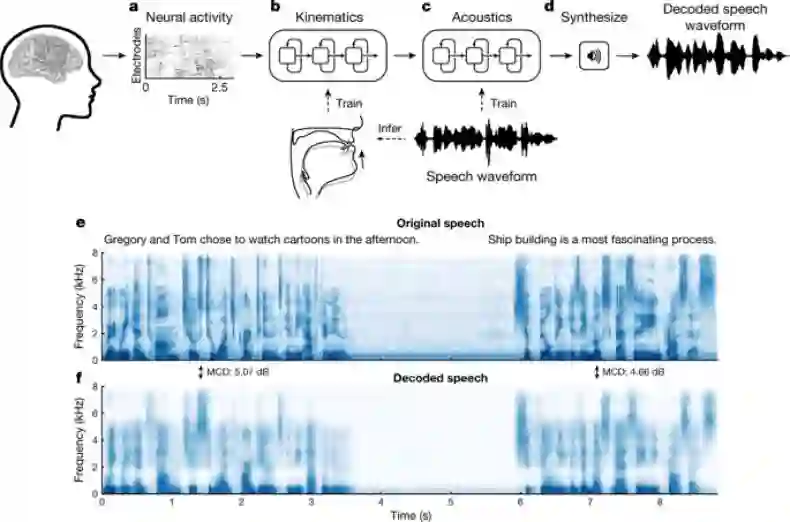 摘要:将神经活动转换成语音的技术对于因神经系统损伤而无法正常交流的人来说是革命性的。从神经活动中解码语音难度很大,因为说话者需要对声道发声部位进行非常精准、快速的多维度控制。本研究设计了一个神经解码器,显式地利用人类大脑皮层活动中编码的运动表示和声音表示来合成语音。首先用循环神经网络直接将记录的大脑皮层活动解码为发音运动的表示,然后将这些表示转换为语音。在封闭的词汇测试中,听众可以识别和转录出利用大脑皮层活动合成的语音。中间的发音动态即使在数据有限的情况下也能帮助提升性能。解码后的发音运动表示可被「说话人」极大地保存,使得解码器的组件可在不同参与者之间迁移。此外,该解码器可以在参与者默念句子时合成语音。这些发现提升了使用神经假体技术恢复交流能力的临床可行性。
