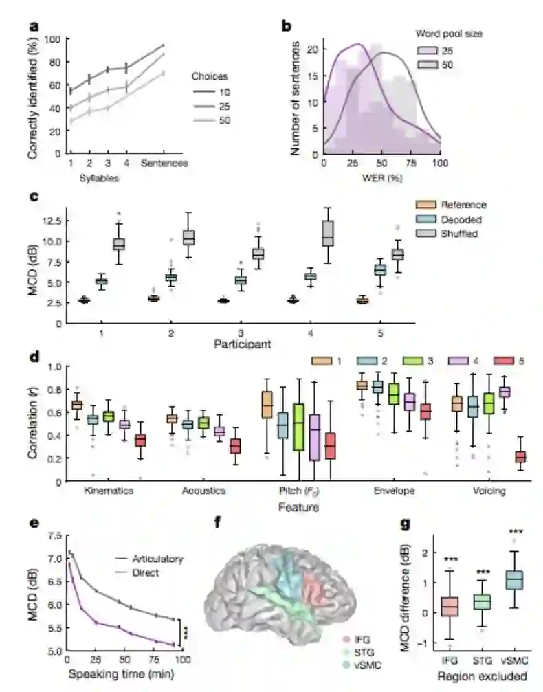 解码器的一个关键组成是中间发声表示(见下图 b)。这一步非常重要,因为 vSMC 在语音合成期间表现出稳健的神经激活,语音合成期间主要编码发音运动。由于连续语音的发音追踪在该研究的临床环境中并不可行,因此研究者利用一种统计方法根据声音记录来估计声道运动轨迹(嘴唇、舌头和下巴的运动)以及其他生理特征(如发声方式)。这些特征初始化了语音编码器-解码器中的瓶颈层,训练该编码器-解码器的目的是重建参与者的言语声学。然后用编码器来推断用于训练神经解码器的中间发声表示。利用这种解码策略,可以准确地重建语音频谱。