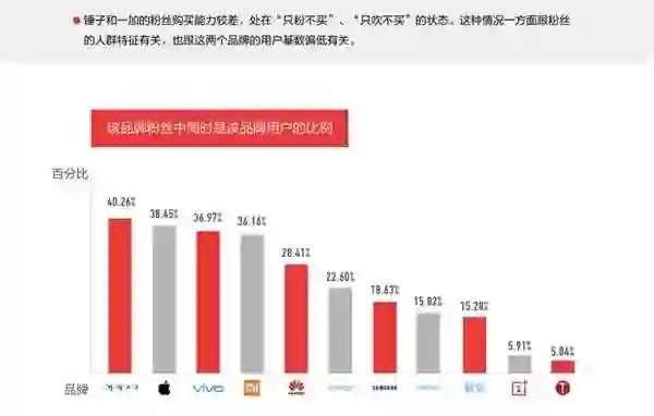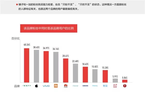 而一加和锤子两个品牌就略显尴尬了,粉丝中同时又是用户的比例仅有 5.91% 和 5.04%。也就是大约 20 个粉丝中只有 1 人在用该品牌手机。今日头条对此的描述是,锤子和一加的粉丝购买能力较差,处在“只粉不买”“只吹不买”的状态。对此,大家怎么看?