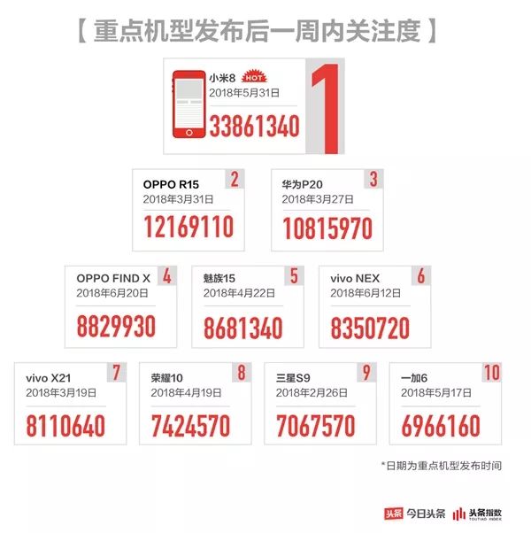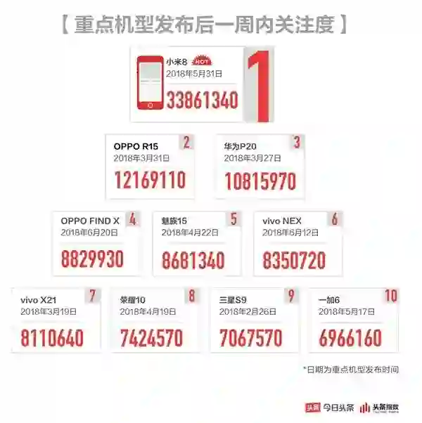 头条指数还统计了各大重点机型发布一周内的资讯阅读量,发现小米 8 的热度居全部机型之首。而小米的粉丝为其贡献了高达 25.05% 的资讯阅读量,显示出最高的品牌粉丝活跃度和参与度。