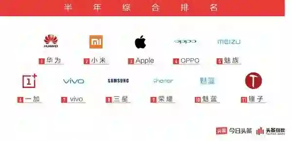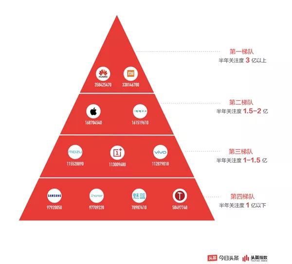就在 7 月 23 日,今日头条发布了 2018 手机行业内容营销白皮书。其中显示今年上半年,华为和小米一起位列品牌关注度第一梯队,关注度均达 3 亿以上。