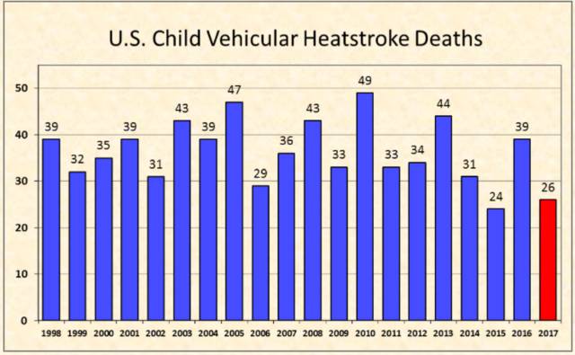 圣何塞州立大学统计的1998-2017年美国儿童在汽车中死于热射病的案例。图片来源:noheatstroke.org