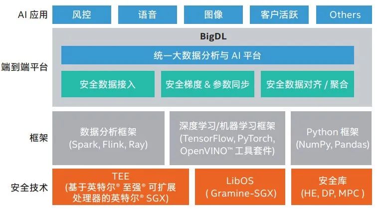 联邦学习中不同安全隐私技术综合评估 在这个行业,企业通常需要将已有的大量 AI 应用以联邦学习模式高效、便捷地扩展到现有的分布式大数据平台上(如 Spark、Flink、Hadoop 集群)。在此过程中,他们可能会遇到一些挑战,比如如何在开展联邦学习时依然保持 AI 训练与推理的高效能?如何在应用 TEE 技术特性时做到数据的全栈可信?如何将二进制应用程序不做改动地运行在 TEE 环境中? 英特尔与中国银联电子商务与电子支付国家工程实验室组成的联合研究团队通过开源的统一大数据分析与 AI 平台——BigDL,验证了基于 TEE 的联邦学习与实时预测方案,有助于解决上述问题。 如图所示,基于英特尔® SGX 技术的 BigDL 提供了自下而上可信的安全技术、不同层面的软件框架以及用于连接大数据平台和联邦学习方法的端到端平台。