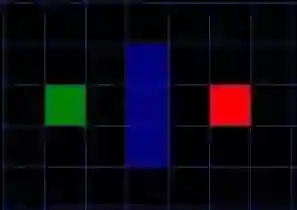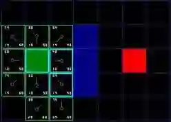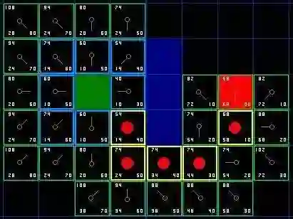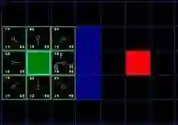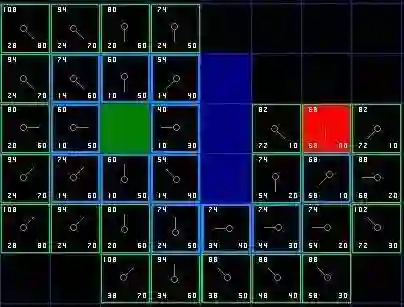 抽象出的矩阵如图4,其中绿色区域表示起始点,红色区域表示目标点,中间蓝色区域表示障碍物(如不可通过的高山或是河流),黑色区域表示可产生路径的区域。