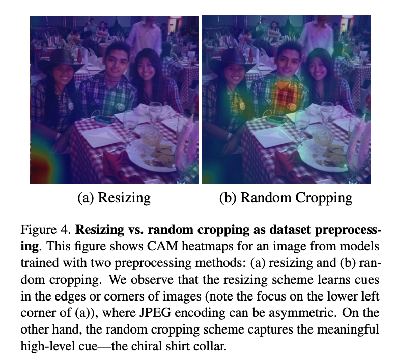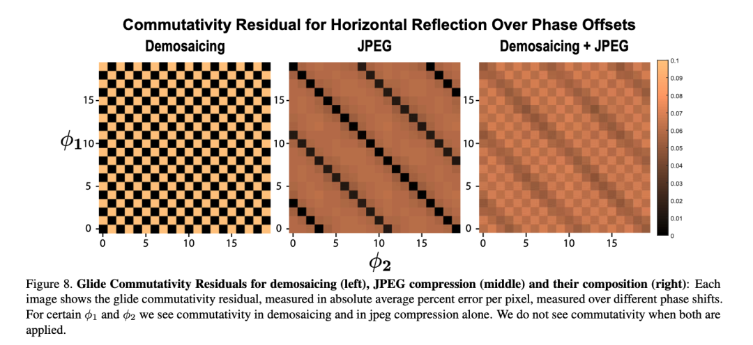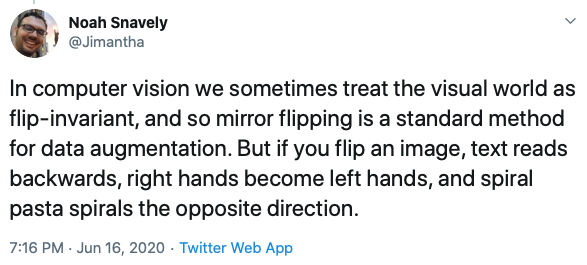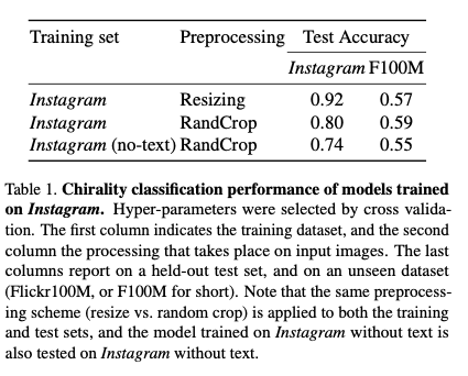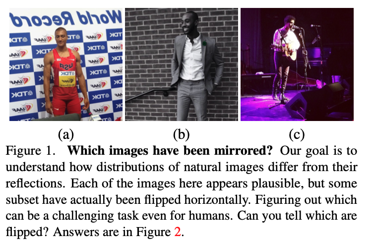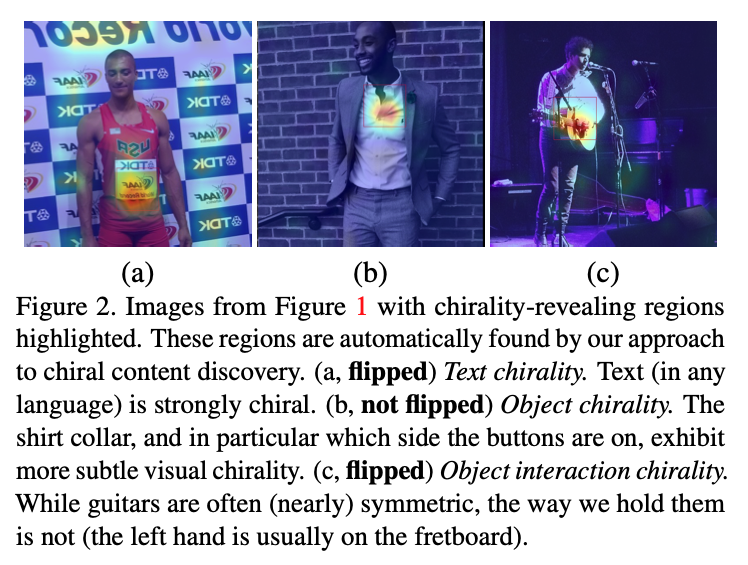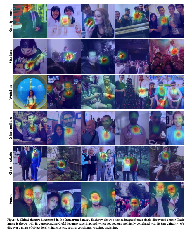 在互联网图片集上,神经网络在镜像翻转识别上取得了高达60%-80%的精度。作者着重分析了Instagram图片上的视觉手性现象。在不用随机剪裁(random cropping)时,神经网络在测试集上取得了高达92%的精度。然而因为有JPEG压缩失真的可能性存在(JPEG edge artifact一般出现于图片的边缘),作者同样使用随机剪裁进行了训练,并仍旧取得了高达80%的精度。考虑到大量Instagram图片有配文字,而文字是最明显的视觉手性现象,作者用文字识别器滤除了Instagram中含有文字的图片重新进行了训练,但仍旧在测试集上取得了74%的高精度。值得一提的是这些训练出来的模型具有一定程度的泛化能力,可以不经训练,在其他的互联网图片集(Flickr F100M)上取得高于50%的精度。作者在Instagram图片集上进行了手性特征聚类,并挑选了一系列与我们生活相关的典型视觉手性现象进行讨论。1、手机对着镜子自拍是人们最爱做的事。此类照片具有视觉手性,因为手机的摄像头一般固定在手机背面的一侧(因品牌而异),同时由于多数人是右撇子,一般都以右手持手机进行自拍。 2、吉他几乎大多数的吉他手都以右手拨弦,左手持把。3、手表手表一般都被带在人们的左手侧。4、男士衬衫领子男士衬衫的扣子一般处于右侧。5、上衣口袋正装上衣的口袋几乎无一例外处于身体左侧,为了更好地服务于占大多数的右撇子。6、人脸更令人吃惊的是,类激活映射方法在大量的人脸上出现了较强的反应,说明人脸中视觉手性的存在。多数情况下人脸通常被认为是对称的:此届CVPR 2020另一篇best student paper(Unsupervised Learning of Probably Symmetric Deformable 3D Objects from Images in the Wild)更是将人脸视为了轴心对称的物体,并以此为线索来进行3D重建。需要强调的一点是,这些视觉手性现象在每张图片中看似孤立,但神经网络仍有可能会利用多种不同的线索来对图片是否翻转进行判断。为了深入了解人脸的视觉手性现象,作者在人脸数据集上进行了孤立训练。作者在Flickr-Faces-HQ (FFHQ)人脸数据集上进行了训练,并在测试集上取得了高达81%的精度,并利用手性特征聚类对人脸中的视觉手性现象进行了初步的探讨:1)刘海分界处人们一般用右手来分理刘海,这会导致刘海的朝向向一侧偏移,并出现视觉手性现象。2)眼睛人们在看向物体时倾向于用一只主视眼进行瞄准,这样会导致人们的目光在进行拍摄时出现偏移。多数人的主视眼为右眼,而这一现象可能是导致视觉手性现象的成因。3)胡子与头发一样,可能与人们习惯于用右手理胡子有关。作者提到,文中对以上的视觉手性现象的讨论均为初步的分析,而人脸中仍有大量的视觉手性线索值得被发掘。