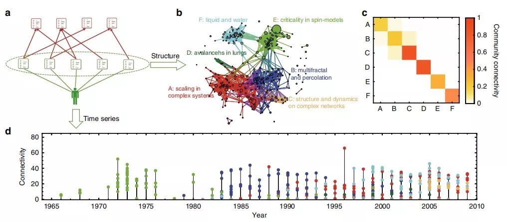 图1d展示的是网络的发展历史,同时揭示了这位科学家在其职业生涯中是如何从一个研究课题转移到另一个研究课题的。在时间序列的子图中,每个点都是一篇文章,颜色对应于共引网络中的不同社团,点的高度是文章在网络中的连边数。
