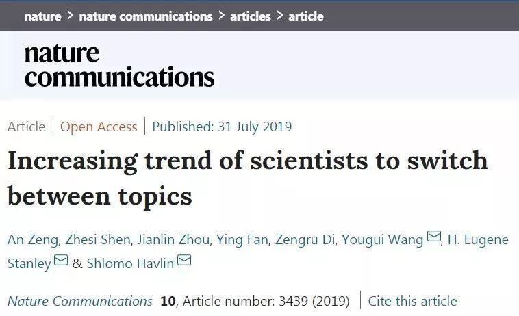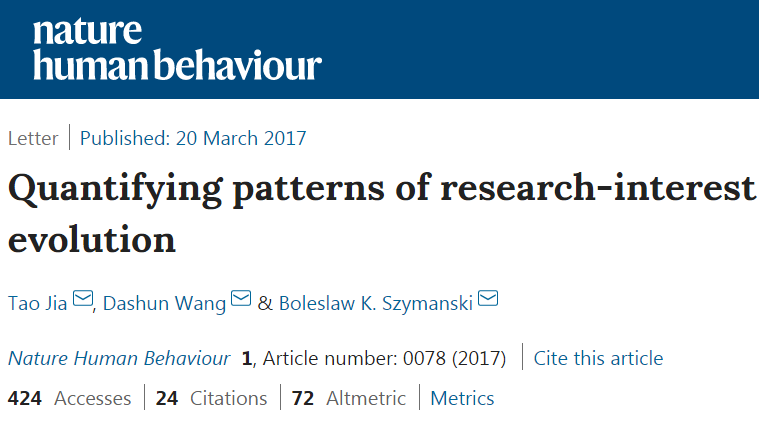 《Increasing trend of scientists to switch between topics》主要在科学家个人职业生涯中短期(逐篇文章)的尺度下,研究科学家兴趣转移的微观动力学问题。