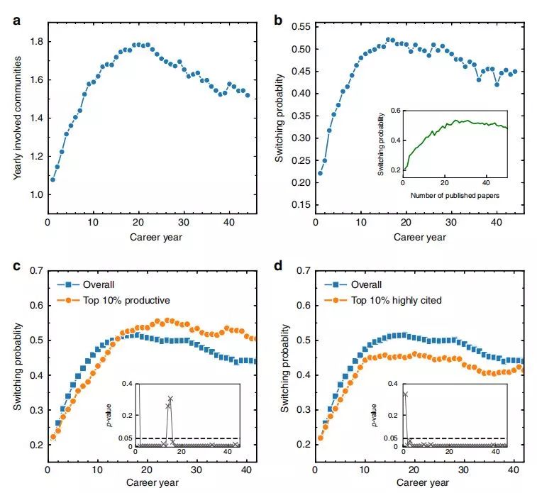 此外,文章在图3d中比较了论文平均引用率最高的10%的科学家的转换概率和全部科学家的转换概率。如图所示,在所有科学家职业生涯中,论文的高平均引用率与低转换概率相关。这一有趣的发现可能是因为较高的转换概率降低了在某一特定领域专家的印象,从而导致了较少的引用率。进一步,文章对转换概率进行了Kolmogorov–Smirnov检验。图3c与图3d的插图中所示的小P值大多数小于0.05。