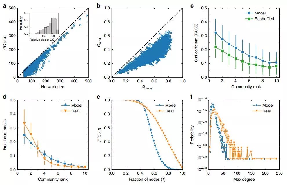 图6a显示了EEM模型生成的共引网络(CCN)的大小与其最大连通子图(GC)的大小之比。每一点都代表一个模拟科学家。图6b绘制了EEM模型生成的共引网络(CCN)中的最大模块度Qmodel和其对应的随机化网络的最大模块度Qrand的分布值。图6c展示了不同社团PACS码分布的基尼系数,其中社团按大小按降序排列,并将EEM模型数据与对应的随机化网络的PACS码进行比较,其中PACS码被重新匹配。图6d展示了真实数据和EEM模型数据在不同社团中的论文分数。图6e对于真实数据和EEM模型数据,三个最大社团中节点分数的逆累积概率。图6f展示了科学家真实数据和EEM模型数据的最大度分布。在这个图中,EEM的参数被选择为P=0.6和Q=0.2,误差条代表标准偏差。