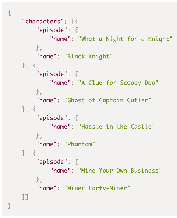 运行以上代码的结果是 JSON 响应,其中包含浏览器中显示的角色和剧集数据。