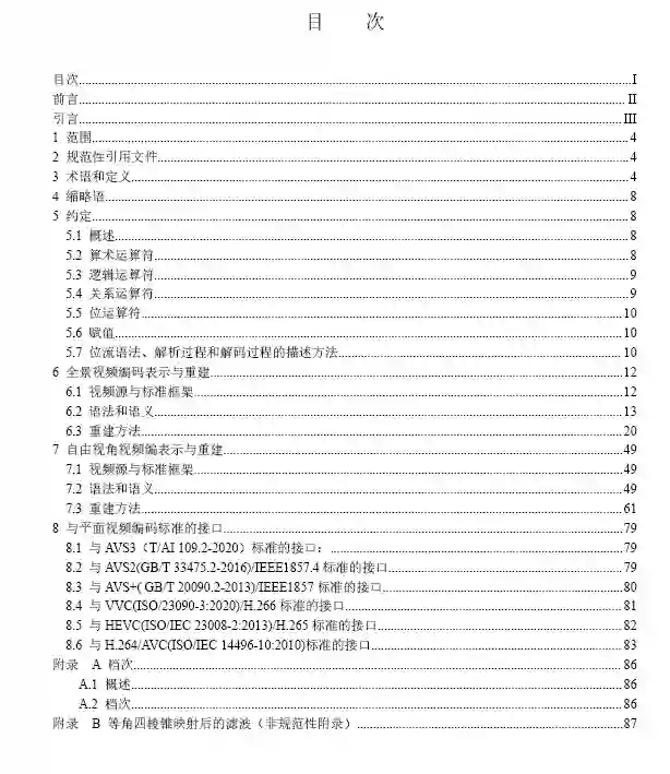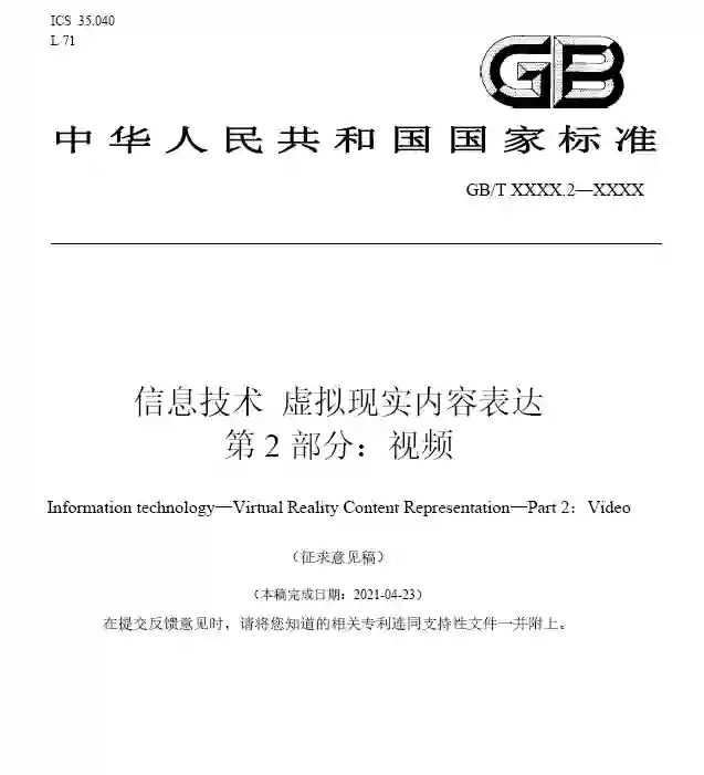 《信息技术虚拟现实内容表达》国家标准意见稿,本文件给出了本标准规定了虚拟现实视频内容的高效编码表示与重建方法,包括压缩域的语法、语义以及重建过程。具有如下特征:(1)支持不同设备间虚拟现实视频内容的互联互通;(2)支持虚拟现实视频内容的高效紧凑表示;(3)兼容平面视频编码标准。本标准定义的虚拟现实视频内容分为两大类:全景视频(三自由度视频)和自由视角视频(六自由度视频)。本标准适用于虚拟现实视频内容录播、点播、直播、通信,节目编辑、制作等应用。
