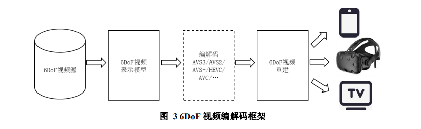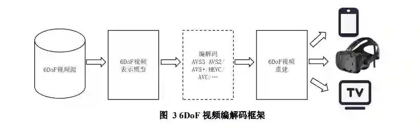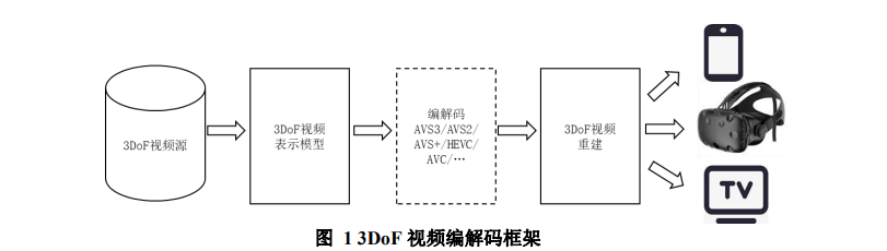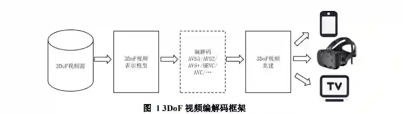 三自由度(3DoF)视频,可以提供用户以三维空间的一个点为中心在X、Y和Z轴三个方向进行自由旋转观看体验。本标准定义的3DoF视频源是对以观察者为中心的球面上的光线进行均匀采样得到的像素集合构成的球面视频。为了便于存储和处理,本标准将球面视频通过3DoF视频表示模型映射为平面视频。3DoF视频编解码整体框架如图1所示, 在编码端,3DoF视频源被映射为某种3DoF视频表示模型,用符合平面视频编码方法进行压缩,并将和3DoF视频表示模型相关的语法信息嵌入到视频位流中;在解码端,依据由位流中解析的3DoF视频表示模型将解码得到的平面视频重建为球面视频,在终端设备中播放,播放终端不限于VR终端、手机、电视等。