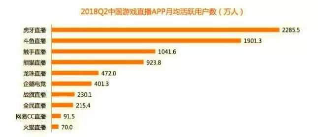 根据《比达咨询:2018年第2季度中国游戏直播市场研究报告》来看,按照越活排名前三的是虎牙、斗鱼、触手,月活过千万,熊猫、龙珠、企鹅、战旗、全民的月活数量则在百万级别;其余网易CC、火猫月活几十万。