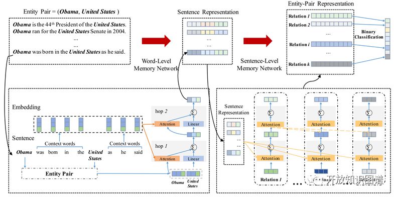本文提出的模型包括两个基于注意力的记忆神经网络,第一个是单词级别的记忆网络,用于句子中不同单词的权重学习,每个单词的权重与两个实体有关;第二个是关系级别的基于注意力的记忆神经网络,用于学习不同句子实例的权重和关系间的依存关系。