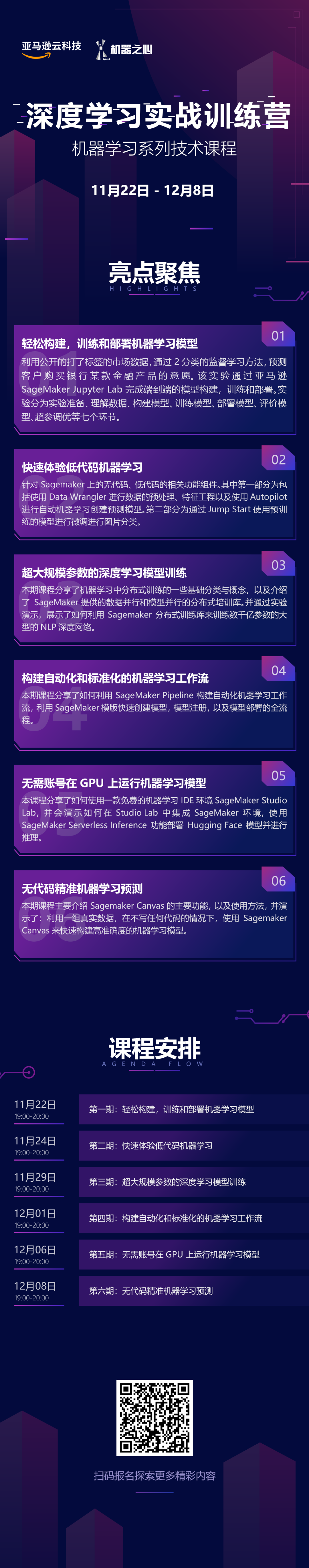 为了帮助开发者快速提升实战能力,机器之心联合亚马逊云科技开设了《深度学习实战训练营》线上实战营。实战营为期3周,共6次课程,还有6次课后作业,实战营期间讲师将在答疑群中随时解决同学的疑问,全程免费,欢迎希望上手实操深度学习的同学加入学习。