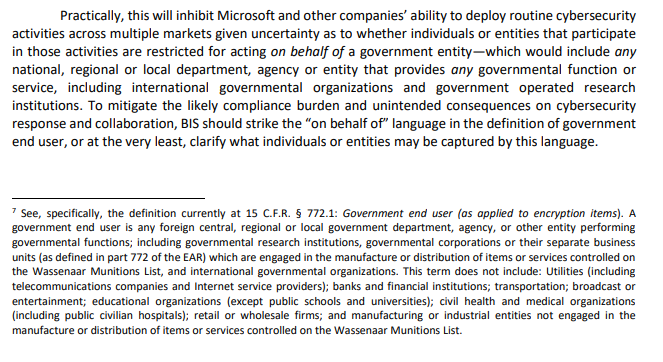 BIS虽然承认了微软所担忧的问题,但最终拒绝了该提议,BIS认为微软的建议将破坏新规的整体意义,BIS在回应中表示:“然而,由于许可证要求的范围和适用性有限,BIS认为该要求将保护美国的国家安全和外交政策利益,而不会对合法的网络安全活动造成不当影响。”