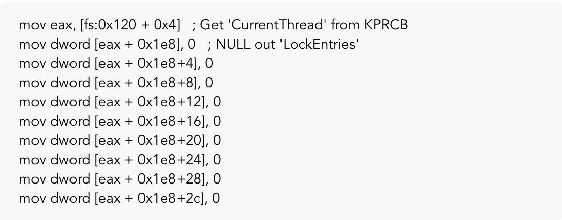 这是由于我们的方法只是跳过内核释放锁获取的过程。为了让我们退出syscall,我们需要更新shellcode,通过将我们的线程值清零来从线程中删除锁定: