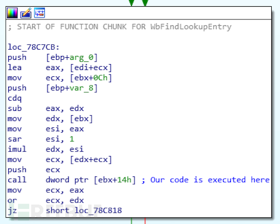 如果我们反汇编shellcode之前的最后一个函数WbFindLookupEntry,就可以找到调用shellcode的位置: