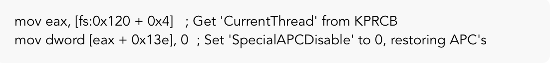 这是可以预料的,因为我们只是忽略了在内核中恢复APC执行的任何形式。 在这个例子中,我们可以简单地通过更新当前线程来修正这个错误: