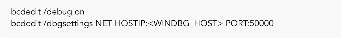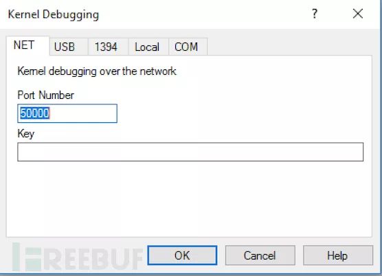 在执行之后,你会获得一个WinDBG用来在启动时建立主机连接的密钥。在我们的调试目的的主机中,我们需要启动WinDBG,并通过“File -> Kernel Debug”设置我们的内核调试会话: