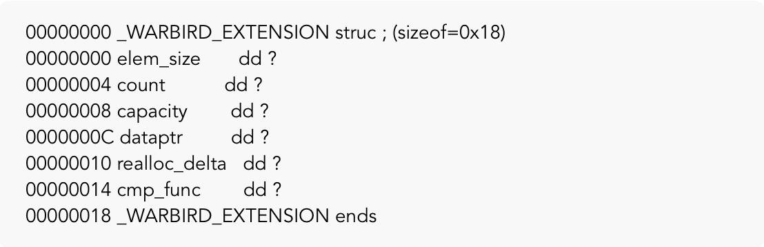 在这里,dword ptr [ebx+14h]调用实际上是调用上述结构中的cmp_func属性,这意味着在进入shellcode时,ebx寄存器指向_WARBIRD_EXTENSION结构。