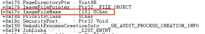 要找到“cmd.exe”,需要使用在偏移150h处找到的EPROCESS.ImageFileName属性: