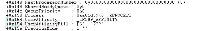 我们在这里找的是在偏移4h(或KPCR开始的124h)处找到的,并且是对应于当前正在执行的线程的nt!_KTHREAD结构。我们可以使用下方命令转储这些信息: