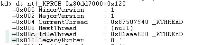 上面的例子中,在地址80dd7000h中有我们的nt!_KPCR结构。知道了这一点,我们就可以使用下方命令查看KPCR的内容: