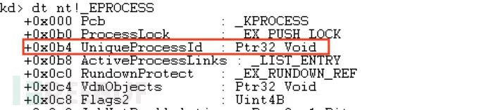 对于System进程,我们知道通常PID为“4”,所以可以在偏移量为b4h的UniqueProcessId属性中找。
