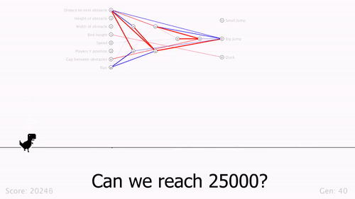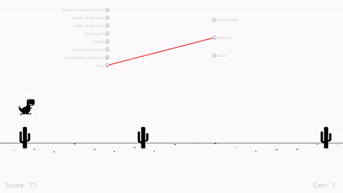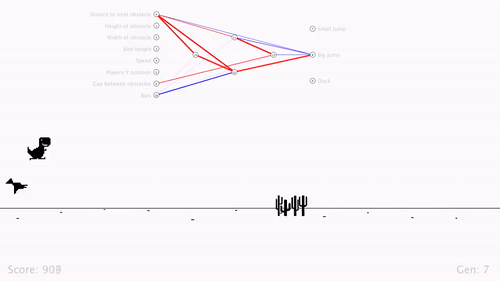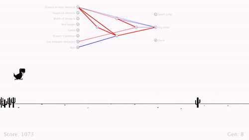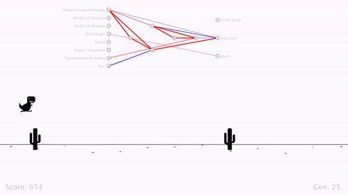 第一代AI有500只,每一只控制着一只恐龙。发挥最好的 AI 可以进入繁殖阶段,不行的AI就莫得繁殖。而且下一代的策略会和上一代有一点点不同,类似于遗传突变。