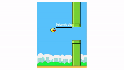 在 Flappy bird 里,小哥设定 AI 可以看到鸟鸟和柱子的距离、鸟鸟相对于柱子的速度等信息。剩下的该怎么玩 AI 自便。