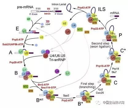 RNA剪接这一复杂的生理过程由剪接体(spliceosome)来执行。剪接体是细胞中已知的最为复杂的大分子机器,分子量巨大并且高度动态,主要由蛋白质-核酸形成的复合物(ribonucleoprotein,RNP)组装形成,它在前体信使RNA(pre-mRNA)上完成识别、组装、激活、催化等一系列过程,并最终在反应结束后解离成许多小的功能单元,以进入下一个反应循环。根据剪接体的组成与构象的不同,可以将剪接体分为E、A、B、Bact、B*、C、C*、P、ILS等若干状态(图1)。