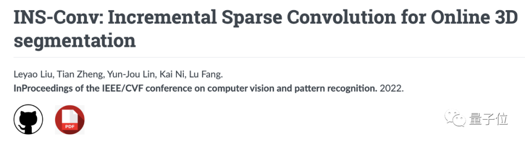 @inproceedings{liu2022ins,  title={INS-Conv: Incremental Sparse Convolution for Online 3D Segmentation},  author={Liu, Leyao and Zheng, Tian and Lin, Yun-Jou and Ni, Kai and Fang, Lu},  booktitle={Proceedings of the IEEE/CVF Conference on Computer Vision and Pattern Recognition},  pages={18975--18984},  year={2022}}   br