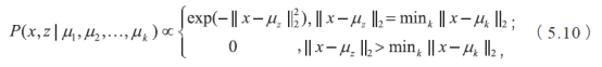 其中是模型的隐变量。直观地理解,就是当样本x 离第k个簇的中心点μk 距离最近时,概率正比于,否则为0。