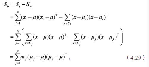 如果把全局散度定义为类内散度与类间散度之和,即St=Sb+Sw,那么类间散度矩阵可表示为
