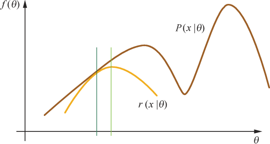 ;因此,,不等式右侧函数记为r(x|θ)。当等式成立时,我们相当于为待优化的函数找到了一个逼近的下界,然后通过最大化这个下界可以使得待优化函数向更好的方向改进。